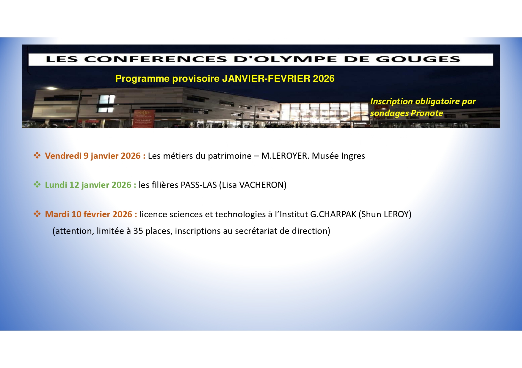Ces conférences s'adressent à tous les élèves. Elles font intervenir des professionnels de divers domaines et des étudiants. Elles permettent aux élèves de découvrir des métiers/formations et de construire leur projet en toute conscience.